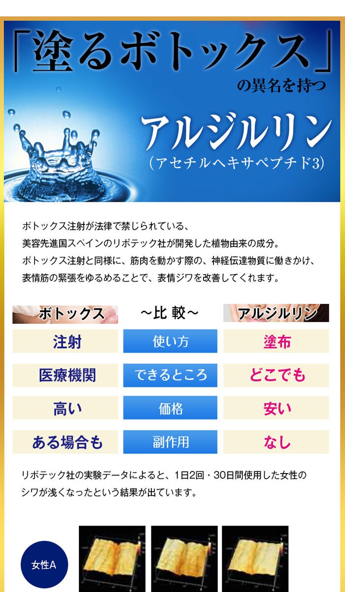 原材料ローズ水、BG、グリセリン、アセチルヘキサペプチドー3、水溶性プロテオグリカン、アセチルグルコサミン、プラセンタエキス、加水分解コラーゲン、ヒアルロン酸Na、PPG-4セテス-20、DPG、セラミド2、エラスチン、アロエベラ葉エキス、カッコンエキス、クロレラエキス、カルボマー、アルギニン、フェノキシエタノール