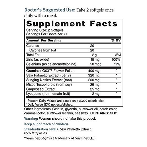 A common concern for men as we age is maintaining a healthy prostate as well as normal urinary function, because prostate concerns and increased urinary frequency can wreak havoc on your sleep, mood, and overall confidence level. Dr. Sinatra's Prostate Solutions formula gets to the root of the problem with a nutrient called Graminex G63TM flower pollen extract. Graminex G63 contains a wealth of health-supporting elements, including peptides, fatty acids, vitamins, minerals, nucleic acids, phytosterols, flavonoids, and antioxidants. Graminex G63 flower pollen is grown pesticide- and herbicide-free and is manufactured using an extraordinary extraction process that has been improved and perfected over the years. Extraction is carefully monitored to ensure a consistent, standardized product. Dr. Sinatra chose Graminex G63 as the keystone to his Prostate Solutions formula primarily because it was clinically studied to reduce nighttime trips to the bathroom. In fact, a double-blind placebo-controlled clinical trial showed that Graminex G63 helped improve urinary symptoms, including reducing nighttime trips to the bathroom, as well as improving urinary flow and bladder emptying. You get the full 400 mg research dose of Graminex G63 in each daily dose, plus a robust lineup of tried-and-true prostate health supporters, including saw palmetto, an extensively researched berry extract that has been shown to promote healthy prostate size, efficient voiding of urine in the bladder, and a healthy sex drive. Also included is nettle root extract, a native European herb used in traditional medicine for prostate health. It is believed that this extract helps support healthy levels of testosterone in the blood. In addition, a rich combination of superstar antioxidants--grape seed extract, lycopene, mixed tocopherols, and zinc-protect delicate prostate tissue and promote overall prostate health.Feature