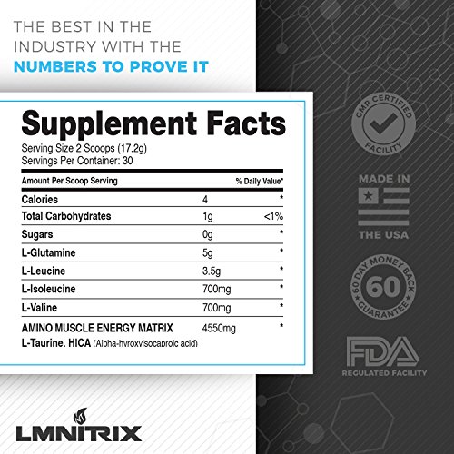 FOUNDED BY ATHLETES, DRIVEN BY A REAL MISSION - LMNITRIX manufactures industry-leading nutritional products that are among the highest quality and integrity on the market. - We stand behind our products and ingredients. - We're proudly based in the USA and involved with Campaign to End Obesity. 3 MOUTH-WATERING BCAA FLAVORS TO CHOOSE FROM Our instantized amino acids taste delicious and come in three mouth watering flavors: - Blue Slush - Watermelon - Mango Ice (BEST SELLER) POWERFUL INGREDIENTS TO LEAVE YOUR SORENESS BEHIND GET RESULTS FASTER Branched Chain Amino Acids are scientifically proven to be effective.. Our BCAA gives you a 5:1:1 ratio.. 3.5g of Leucine, 700mg or Isoleucine and 700mg of Valine. Our BCAA supplement powder contains the highest quality amino acid powders you can buy - GUARANTEED. Other ingredients include: Glutamine (5g): The main amino acid for recovery is often overlooked in Pre-workout, intra-workout, and post-workout supplements. Plus our Taurine HICA Blend: Great for added energy and muscle building. 60-DAY GUARANTEE OR YOUR MONEY BACK Add To Cart Today. 0 |