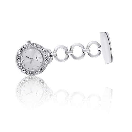 -. Feature : STYLE:Luxury full steel band with rhinestones decorated dial. / SUITABLE:Easy clip-on design, convenient to use. / APPLICABLE PEOPLE:Excellent watch for nurse and doctors. / NOTE:Not waterproof;please don't get in touch with water. / MATERIAL:Stainless Steel Case;Alloy Strap;Alloy Bottom Cover;Titanium Clasp.
