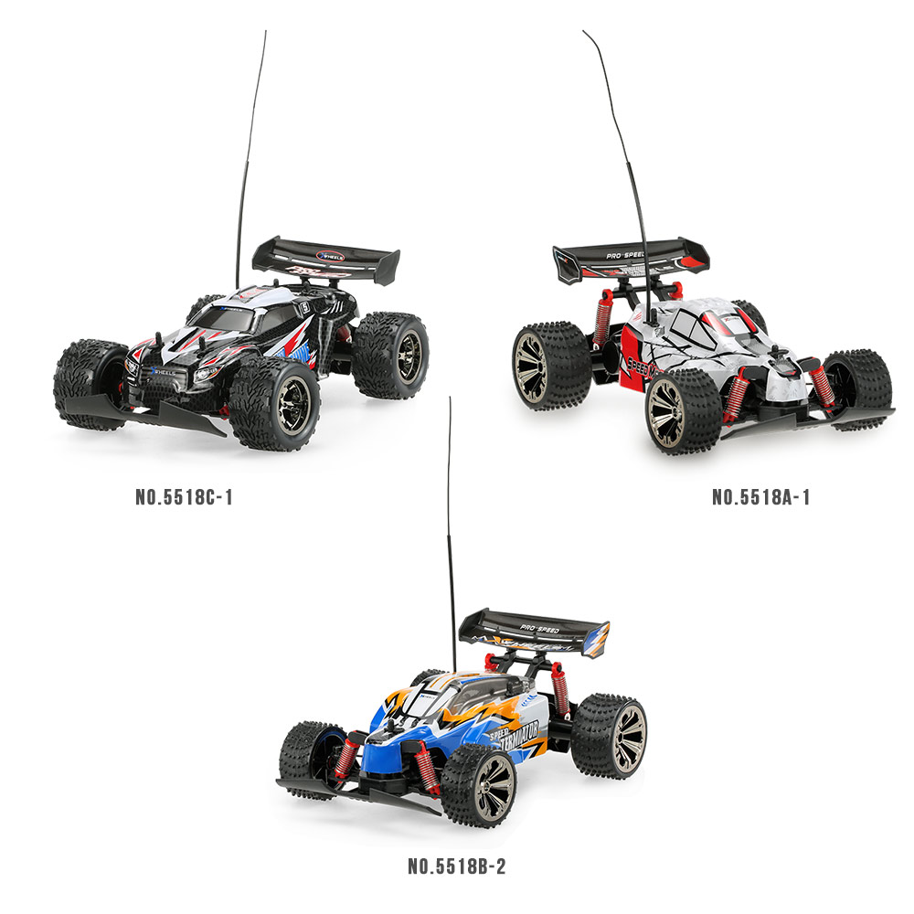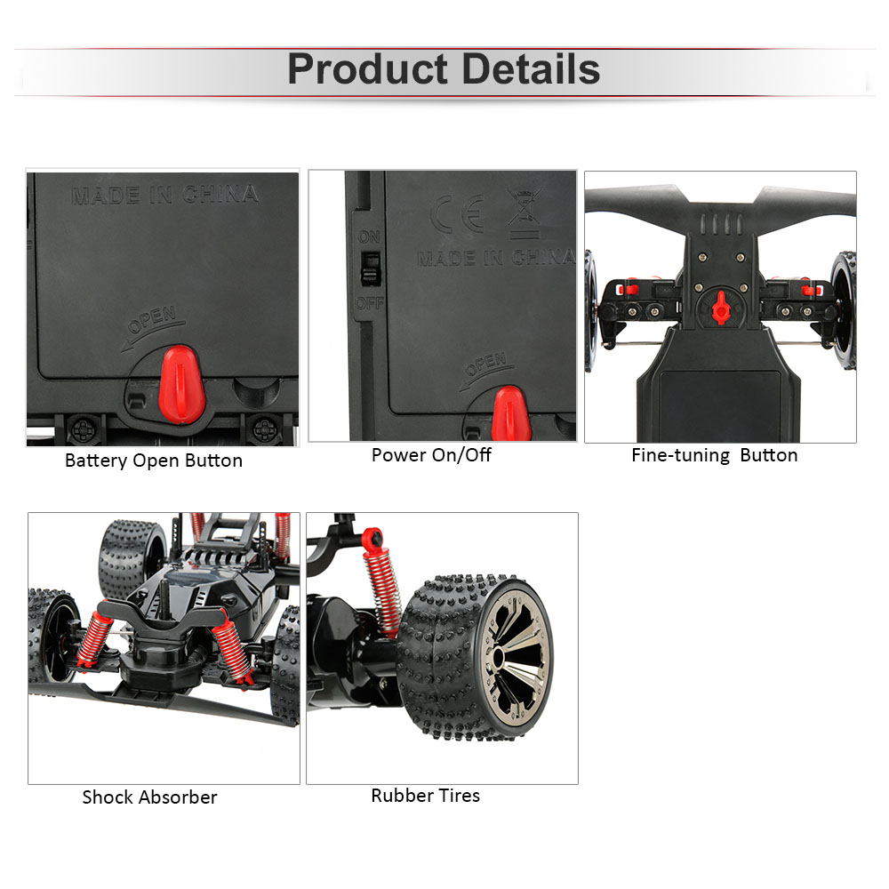 The high speed RC car is 1/16 scale electric RTR. Comes with front-wheeled and rear-wheeled independent suspension, super abrasion resistant rubber tires, high performance shock absorber and professional steering. Besides, it also has full function: forward, backward, turn left, turn right. Put in the battery to charge the off-road car, and enjoy the fun!