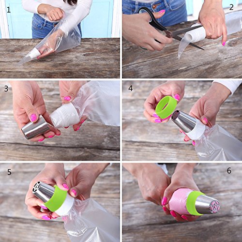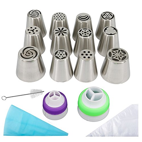 - PROFESSIONAL BAKING SUPPLIES– This cake decorating kit comes with 12x icing nozzles of different flower patterns; 15 disposable pastry bags; 1 reusable silicone bag; two different size couplers; 1 cleaning brush. A must-have tips tool to decorate all your cakes, muffins, cupcakes, cookies, pastry and more.
