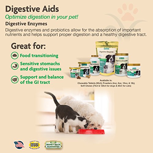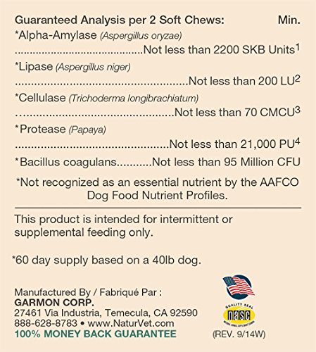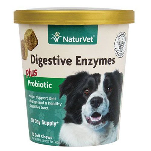 NaturVet Digestive Enzymes Plus Probiotic Helps Support Diet Change and a Healthy Digestive Tract. Provides Probiotics and Important Enzymes to Help Break Down Food for Optimal Utilization of Nutrients. Great for Food Transitioning, Sensitive Stomachs and can Help Reduce Flatulence. Wheat Free, Tasty Soft Chews 120ct for Dogs Over the Age of 6 Weeks. Guaranteed Analysis per 2 Soft Chews: alpha-Amylase, Lipase, Cellulase, Protease and Bacillus coagulans. All NaturVet Products are Veterinarian Formulated and Manufactured in the USA in an FDA Audited, cGMP Compliant Facility with a 100% Satisfaction Guarantee.