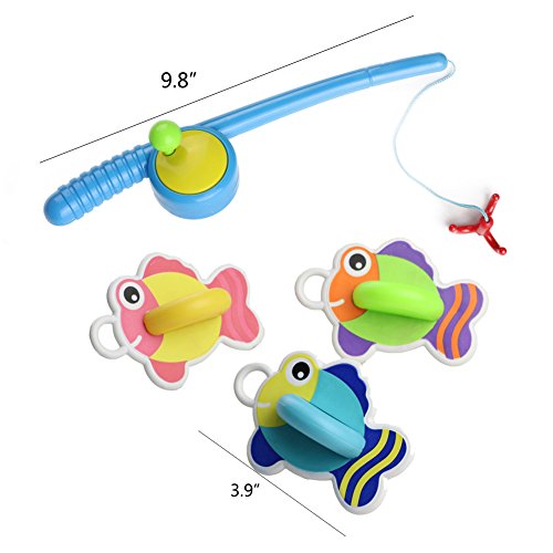 ▶Fun bath toy : Includes a fishing rod and three colorful fishes with cartoon expression.