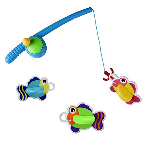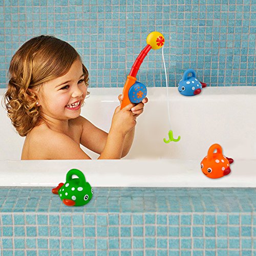 Bath tub toy,includes a fishing rod and three colorful fishes with smiling expression,will appeal to little kids.
