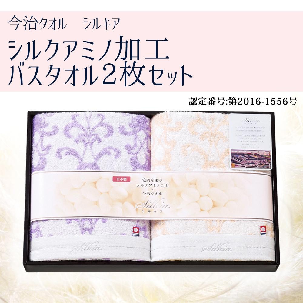 | シルクアミノ加工が施されたバスタオル2枚セットです。シルキアは富岡産まゆからうまれたシルクアミノ加工により、高い保湿効果と抗菌効果に加え、紫外線をカットしてお肌を守るタオルです。 |