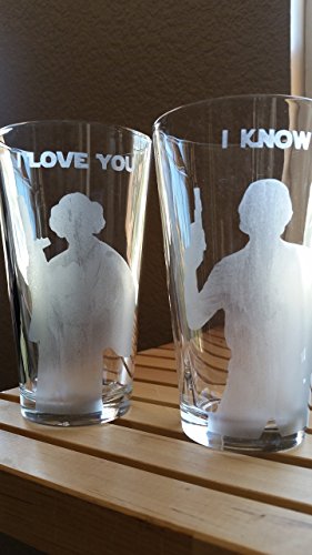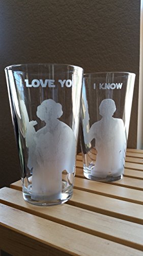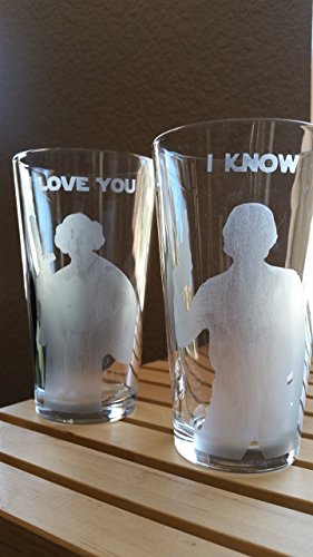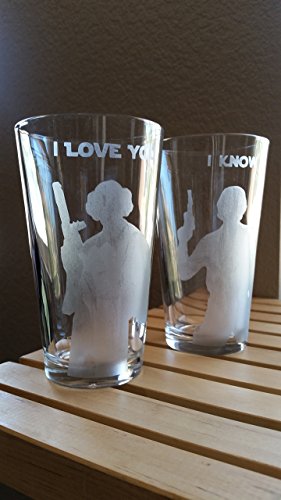 Product Description This is a hand etched Star Wars Han Leia I Love You I Know inspired pint glass set. No matter how many times you wash them, they will never fade! The glass is heat treated and dishwasher safe. This item is already made and ready to ship! 0