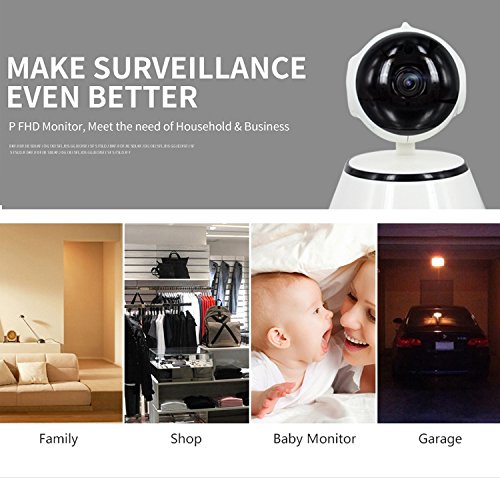 -. Feature : 【Quick and Easy Setup】: Download APP via scan QR code on App store or Google Play. Seamlessly HD video streaming and two-way audio via your smartphone(both Android and IOS).CMS for Computer client. / 【Two Way Audio】 Let you communicate with those in your home; keep your pets out of trouble and stay reassured your kids or elders are doing well / 【Remarkable Field of View】Remarkable Field of View: Remote super fluently Pan/Tilt nearly 355 degree viewing coverage, 1080P high resolution, two-way audio allows you talk and listen freely, adjust the volume at the app super easy / 【Motion Detect Alert】 Continuous day/night surveillance is accomplished with 11 powerful IR-LEDs for night vision up to 30ft. Motion detect sensibility can be adjusted yourself, when monitor is detected or alarm is triggered, instant email notification will be sent / 【 Wide-range In Application】Pet Monitoring, Business Monitoring, Security, Vacation Home Monitoring, Senior Monitoring, Remote Live Video Streaming via Phone, Tablet and PC.
