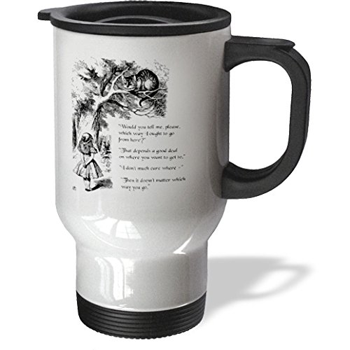 3dRose tm_193784_1 Which Way Ought I Go from Here Cheshire Cat Alice in Wonderland Quote Stainless Steel Travel Mug, 14 oz, White