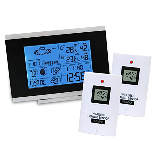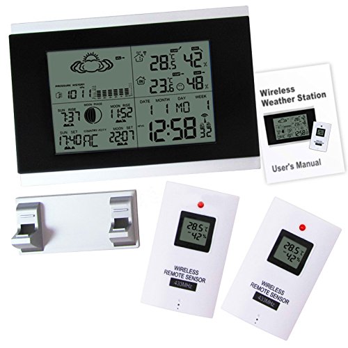WIRELESS WEATHER STATION + 2 REMOTE SENSOR WEATHER STATION MONITORING CLOCKS TEMPERATURE OUTDOORS-INDOORS HUMIDITY WITH BACK-LIGHT