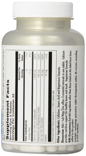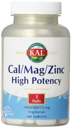 Kal presents calcium/magnesium/zinc high potency vitamin contains 1000 mg of calcium, 400 mg of magnesium, and 15 mg of zinc.