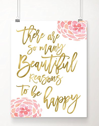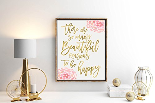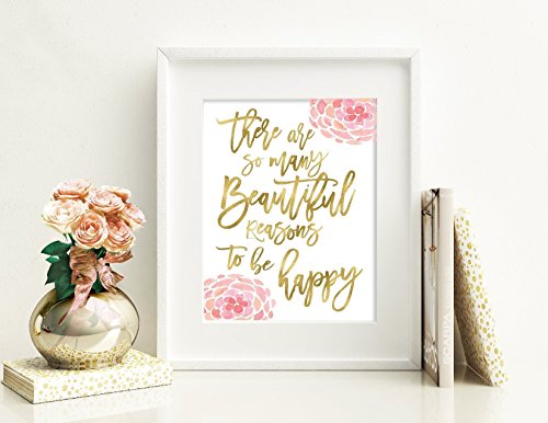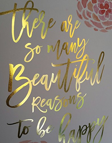 Fall in love with this Inspirational gold foil and watercolor art print. "There are so Many Beautiful Reasons to be Happy" quote is printed in luxe gold foil on extra heavy pure white cardstock paper. Watercolor flower artwork printed with premium ink and looks hand-painted. The gold foil printing process does not work on canvas or thick art board so please note that this listing is for the CARDSTOCK PRINT ONLY and NO FRAME is included with purchase. All prints are sealed in cellophane with double-weight cardboard backing and placed in a rigid photo-mailer envelope then boxed again. Your print will arrive flat and safe or we will replace it. Gift wrap is available during check-out.