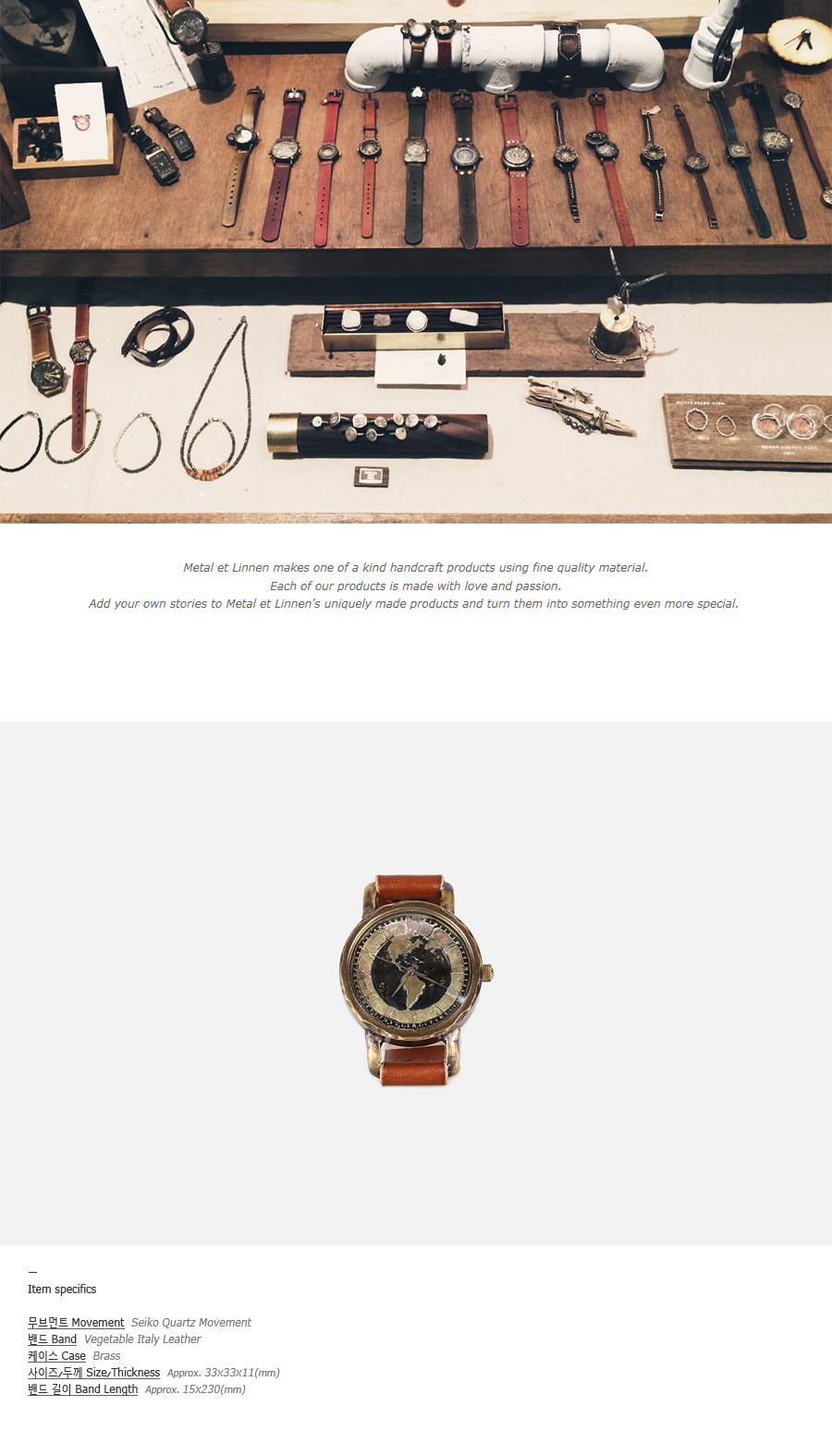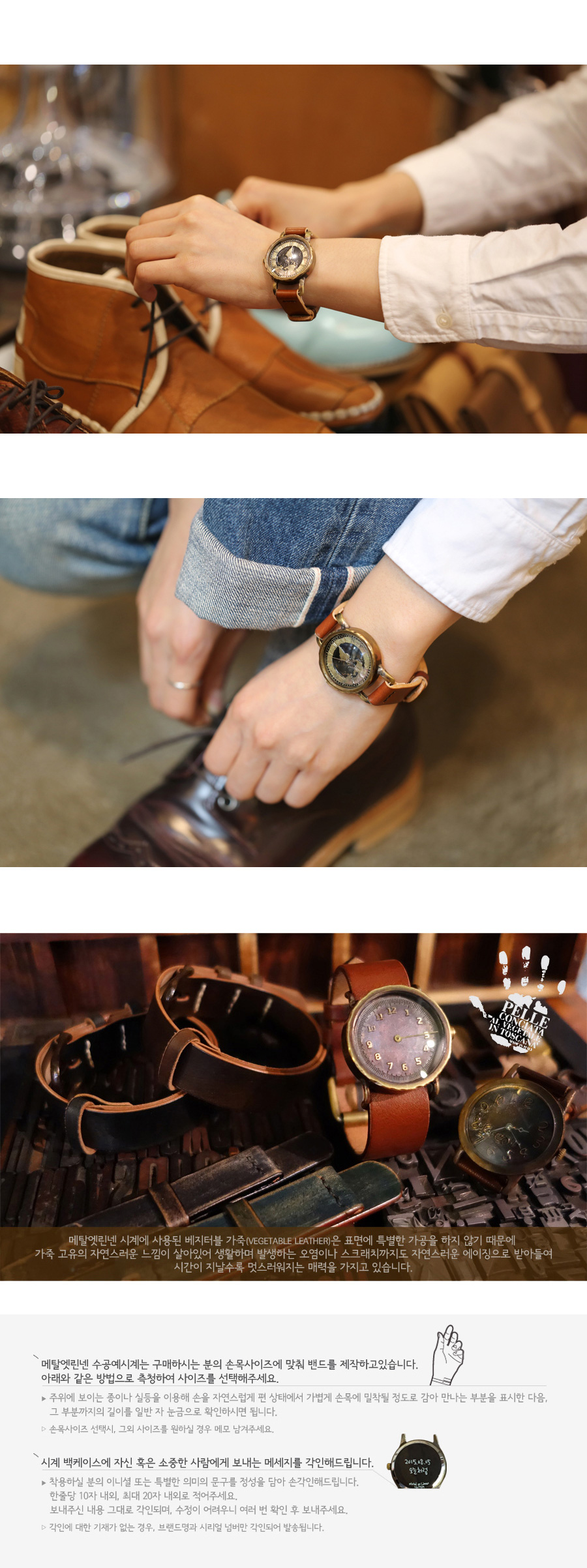 | Handcraft watch ParvaBee(파르바비) 메탈엣린넨의 빈티지 황동(brass) 시계 케이스는 착용할수록 점점 밝아지며, 자연스러운 에이징이 되는 가죽 밴드와 함께 시간이 지나면 지날수록 사용자만의 빈티지한 시계가됩니다. 시계에 사용된 황동은 산화되면서 녹청(patina)이 발생할 수 있으나, 금속광택제(metal polishing compounds) 등으로 닦으면 다시 원래의 황동색을 되찾을 수 있으며 황동만의 독특한 소재감을 느끼실 수 있습니다. |