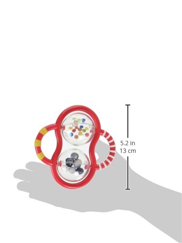Over molded handles for easy grip. Two tumbling balls rattle to inspire hearing. Handles are safe for baby to mouth and teethe. Appropriate for 0+ months of age.