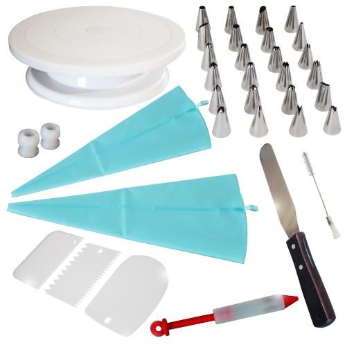 EVERYTHING YOU NEED TO SURVIVE the art of cake decorating; including a cake turntable that runs smoothly on inbuilt ball bearings; 24 piping nozzles to create every design under the sun; piping bags with quick release couplings to change nozzles on the fly; an icing pen for the loving messages you want to send with your masterpiece; cake scrapers and a spatula for creating the perfect surface to decorate and even a clean up brush