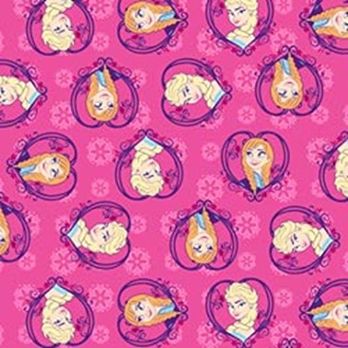 - The sisters, Elsa and Anna is framed in hearts on a pink background. 42/43 wide 100% cotton flannel, 10 yard bolt