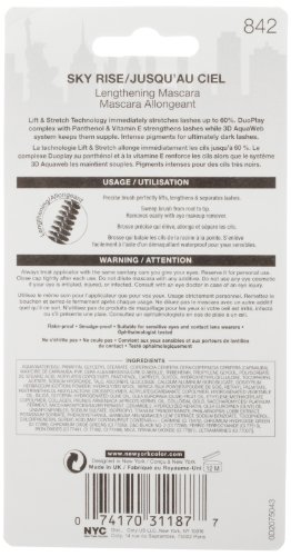 -. Binding : Health and Beauty -. Brand : N.Y.C. -. EAN : 0741655549932 -. Feature : It extends your lashes up to 60%, lifting and stretching them sky-high for an endless eye look. / It won't impact on your spending money either. / Instant lifting and stretching effect / Duo Play Complex with Panthenol and vitamin E softens and strengthens lashes to add extra comfort / Slim Precise Brush lifts and stretches lashes by 70% -. Label : NYC -. Manufacturer : NYC -. MPN : NY842B -. PartNumber : NY842B -. ProductGroup : Health and Beauty -. ProductTypeName : HEALTH_PERSONAL_CARE -. Publisher : NYC -. SKU : MF215407-2 -. Studio : NYC -. Title : NYC Sky Rise Lengthening Mascara Extreme Black (2-pack) -. UPC : 741655549932