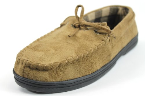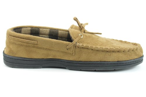 -. Binding : Apparel -. Brand : John Ashford -. Color : Tan -. Department : mens -. Feature : Synthetic microsuede uppers, / Soft Flannel Lining/Flexible Construction for Comfort / Comfortable Foam Cushioning/Padded Insole, Decorative ties. / Rubber Sole / Flat and in original Box -. ProductGroup : Shoes -. ProductTypeName : SHOES -. Title : John Ashford Men's Ronald Microsuede Foam Cushion Moccasin Slippers Tan