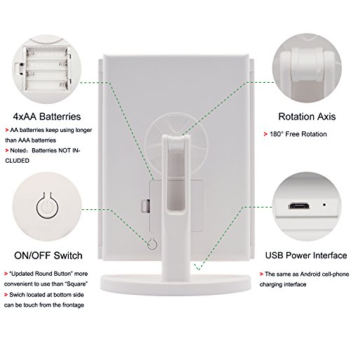 - DOUBLE POWER SUPPLY: This vanity mirror can either operated by 4 pcs AA batteries (not included) or USB cable (USB wire included)to make it work. Tips: USB cable (included) can’t be used for charging.