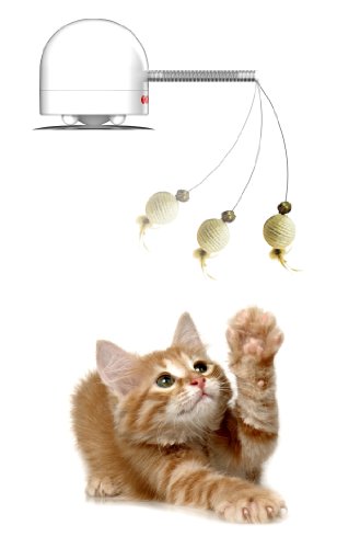 -. Feature : Suction cup allows attachment of TWITCH to any smooth surface / Electronic bird call signals to your cat that a play session is about to begin / Bouncing teaser toy with ball, feather and bell entices your cat to bat and swing / Single play mode launches a one-time 10-minute play session / "Play While You Are Away" mode pre-schedules multiple play sessions throughout the day