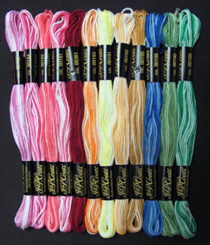 -. Binding : Office Product -. Brand : J P Coats -. Color : Assorted -. EAN : 0073650822698 -. Feature : Pre selected assortment of colors. / Manufactured in India or Mexico. / Solid colors / Variegated colors / Between 78 to 80 unique colors and some duplicates -. Label : J. & P. Coats -. Manufacturer : J. & P. Coats -. PackageQuantity : 10 -. ProductGroup : Art and Craft Supply -. ProductTypeName : ART_SUPPLIES -. Publisher : J. & P. Coats -. Studio : J. & P. Coats -. Title : J. & P. J&P Coats Cotton Embroidery Cross Stitch Floss Thread -. UPC : 073650822698