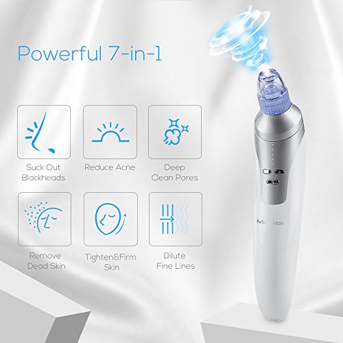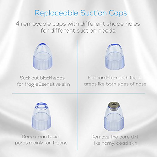 - Multi Functions: Providing four replaceable suction heads, which can meet different clean function, Small Round Hole Head: Remove blackhead, it has weaker suction, which is suitable for sensitive skin;Big Hole Head: it has stronger suction, which is suitable for stubborn blackhead; Oval Hole Head: Reduce micro wrinkle on the corner of eyes, making your skin smooth and tightened; Microdermabrasion head: Reduce dead skin and keratin.