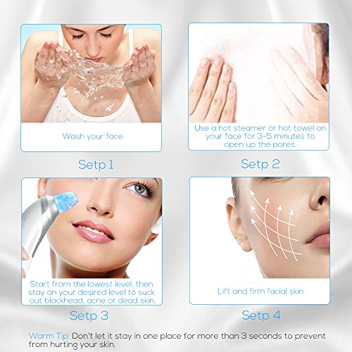 - Steps for Using And Skills Required: Before to use it, please try to open up your facial pores with hot towel or steam; With reasonable suction level, do not suck in a fixed place more than 3 seconds, you have to move the suction head from the top to down(contrary to the direction of pores growth) and do not move back and forth, just moving in one direction; Please use the makeup that close the pores after you finish this pores spa. Above is a complete process to treat your blackheads pores well