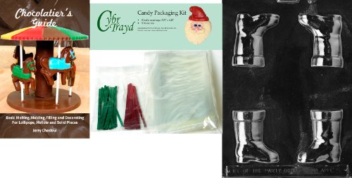 Cybrtrayd Hollow Boot Chocolate Mold with Chocolatier's Bundle of 50 Cello Bags, 25 Green and 25 Red Twist Ties and Chocolatier's Guide