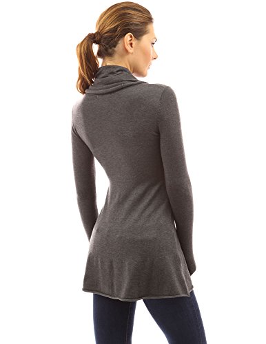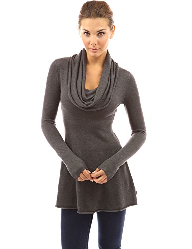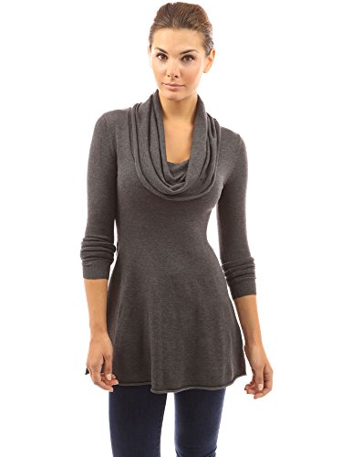 PattyBoutik Drape Cowl Neck Long Sleeve A-Line Tunic Knit Top Sweater. Model in pictures is 5 feet 8 inches (173cm) tall wearing size S.
