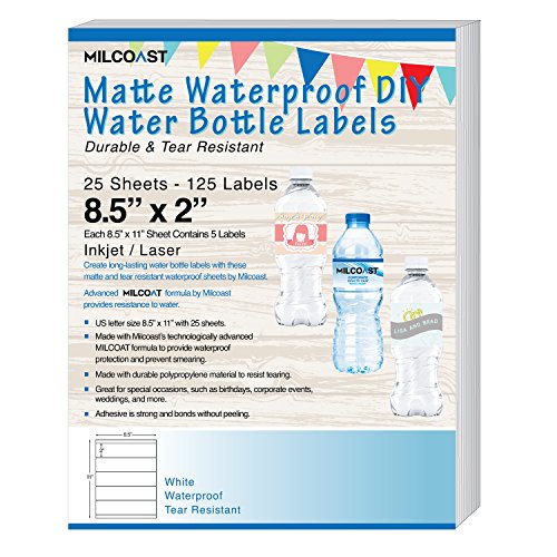 Milcoast Matte Waterproof Tear Resistant DIY Water Bottle Labels 8.5” x 2” for Inkjet / Laser Printers - 25 Sheets