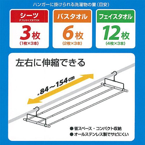 ●干す場所に困る大きなシーツを一度に3枚も干せます●オールステンレスで、さびに強く室外での使用におすすめです●干す場所に困る大きなシーツを一度に3枚も干せます!オールステンレスで、さびに強く室外での使用におすすめです!●干す場所に困る大きなシーツを一度に3枚も干せます!●商品サイズ幅:840~1540●商品サイズ奥行:280●商品サイズ高さ:170●素材:ステンレス、ポリエチレン●生産国:中国