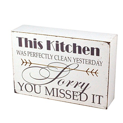 - Painted white with a distressed look around the edges with message "his kitchen was perfectly clean yesterday Sorry you missed it" in grey lettering
