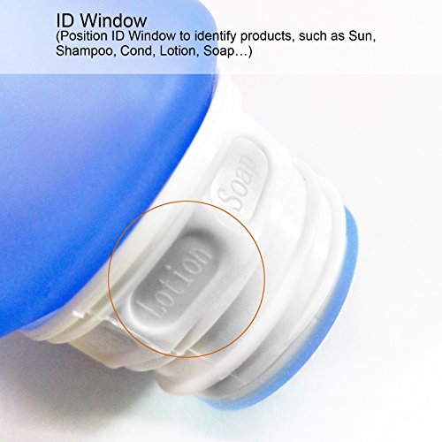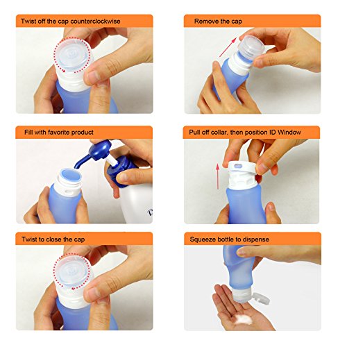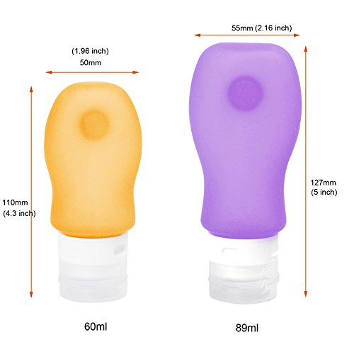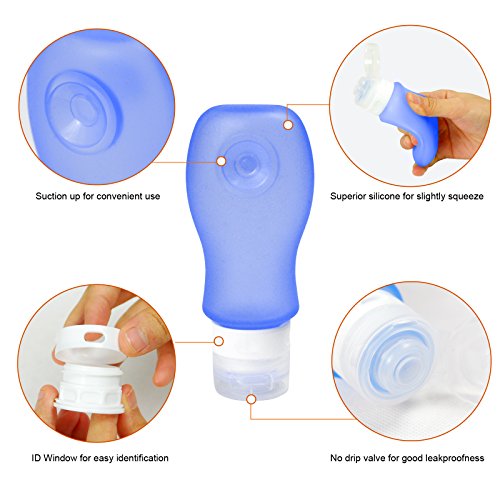 - Feature : Set your mind in peace with Lavievert's high quality TSA approved silicone travel bottles during your travel, business or camping. Food grade silicone makes it safe for transporting liquids, pastes and creams. Can be easily cleaned by soaking in warm soapy water. / Designed with wide mouth for easy refilling, a silicone stretchy valve in the small mouth and a 2-layered anti-leakage cap, this tube can perfectly prevent leaks and spills of shampoo, conditioner, sunscreen, lotions and body wash. Squeeze and release to get exactly how much you want without globs of excess oozing out. / Strong suction cup can temporarily attach your bottles on the smooth surface such as hotel tiles, glass or mirror for easy access to your shampoo or body lotions with a gentle squeeze. / With 5 pre-printed labels Shampoo, Conditioner, Lotion, Soap and Sunscreen, you can easily identify the contents of your travel tubes using the ID window of the adjustable collar. 3 more blank labels for you to write the contents such as hand cream, foundation or eye make-up remover. / Unscrew cap and fill only 80%-90% of capacity to allow room for expansion while travelling by airplane. Size: 2 x Large (3oz/90ml) & 2 x Middle (2oz/60ml) Bottles; Color: Blue, Purple, Orange,White. Can be carried and organized in your luggage or briefcase neatly.