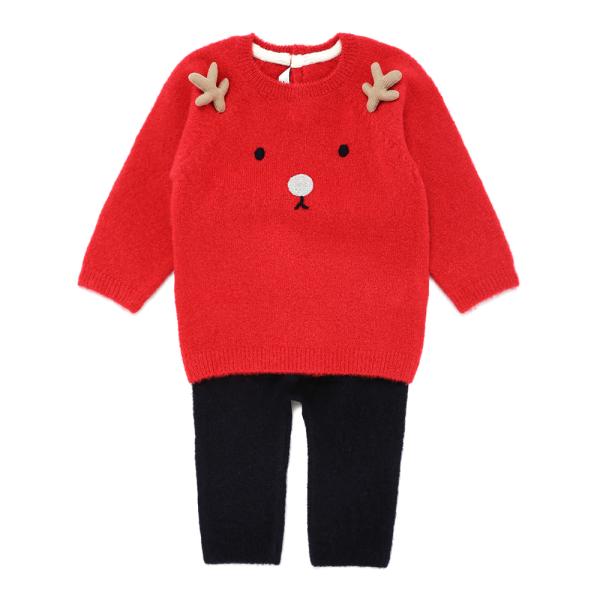 _루돌프의 뿔이 돋보이는 원포인트가 강조된 니트 상하복입니다.
