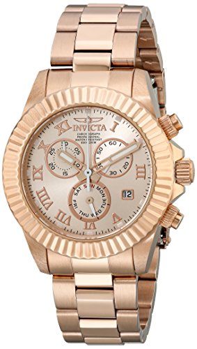 Rose gold-plated stainless steel case and bracelet. Fixed roae gold-plated bezel. Rose dial with luminous rose gold-tone hands and Roman numeral hour markers. Minute markers around the outer rim. Dial Type: Analog. Luminescent hands and markers. Date display at the 4 o'clock position. Chronograph - two sub-dials displaying: 60 second and 30 minute. Day of the week sub-dial at the 6 o'clock position. Quartz movement. Scratch resistant flame fusion crystal. Pull / push crown. Solid case back. Case diameter: 40 mm. Round case shape. Band width: 20 mm. Band length: 8.25 inches. Fold over clasp with safety release. Water resistant at 200 meters / 660 feet. Functions: chronograph, date, day, hour, minute, second. Casual watch style. Invicta Pro Diver Chronograph Rose Dial Rose Gold-tone Ladies Watch 18959.Feature