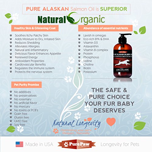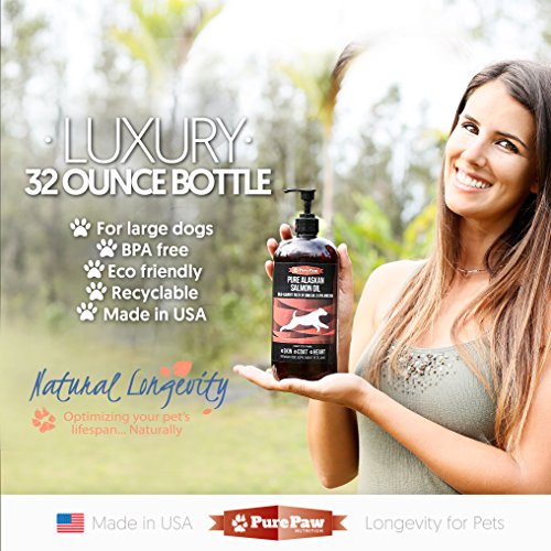 - Feature : 100% Wild-caught Alaskan salmon oil certified sustainable, toxin and GMO free. Its deep rich color is due to the salmon's natural diet and environment / Let us keep your pooch's coat radiant and save $183 per vet visit for itching patchy flaky skin / Higher ratio of DHA to EPA, which reduces protein molecules that are responsible for causing inflammation and allergies / Luxury BPA free & eco friendly 32oz bottle with a sealed cap to avoid leakage accompanied with a superior pump for no mess dispense / Combine with Dog Dream Glucosamine for joint rejuvenation and make a risk-free holistic choice he will love his new coat we are PAWSITIVE or your money back