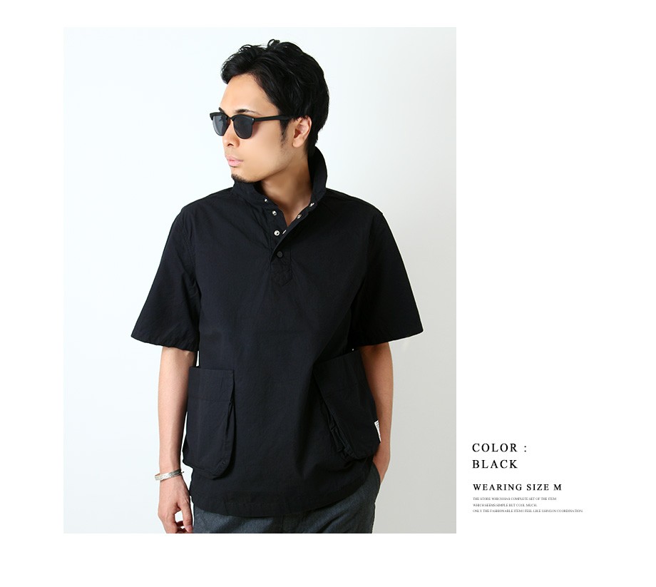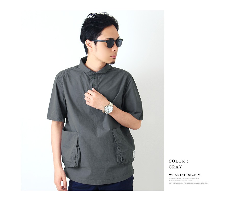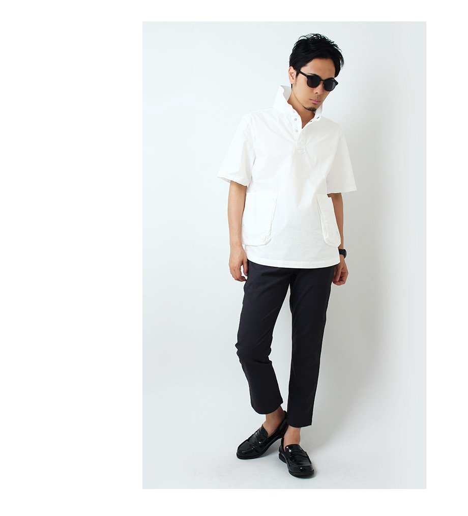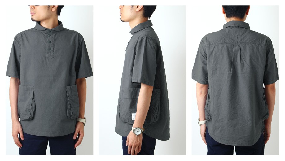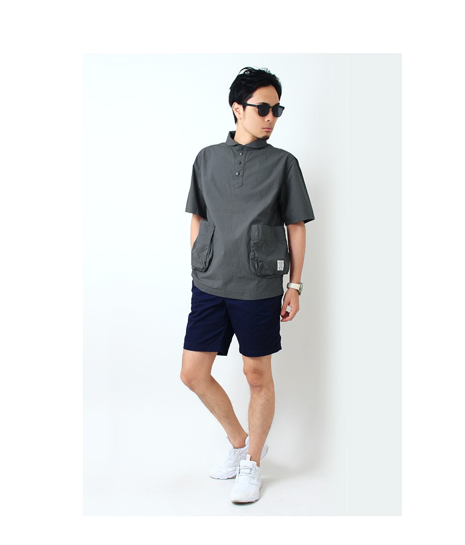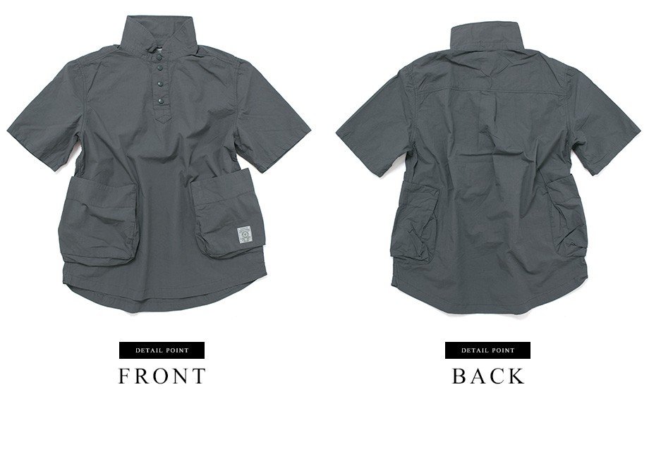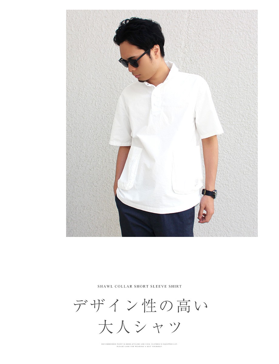ポケットデザインが印象的なコットンポプリン半袖シャツ。デザイン性の高いショールカラーは立ち衿でも通常の着こなしも雰囲気良くスタイリングしていただけます。高密度のポプリン生地もしなやかな風合いながらタフな印象で価値ある仕上がり。大人の雰囲気を漂わせるデザインシャツです。