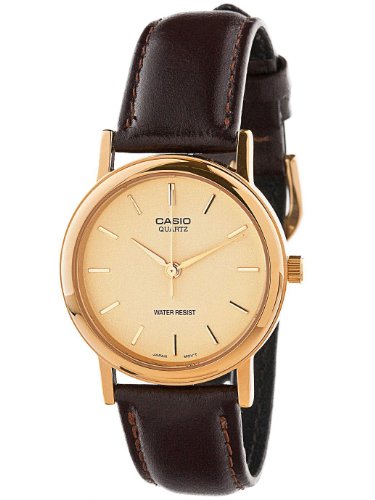 -. Title : American Apparel MTP-1095Q-9A Casio Analog Leather Strap Watch -Brown / Gold Lines / Gold
