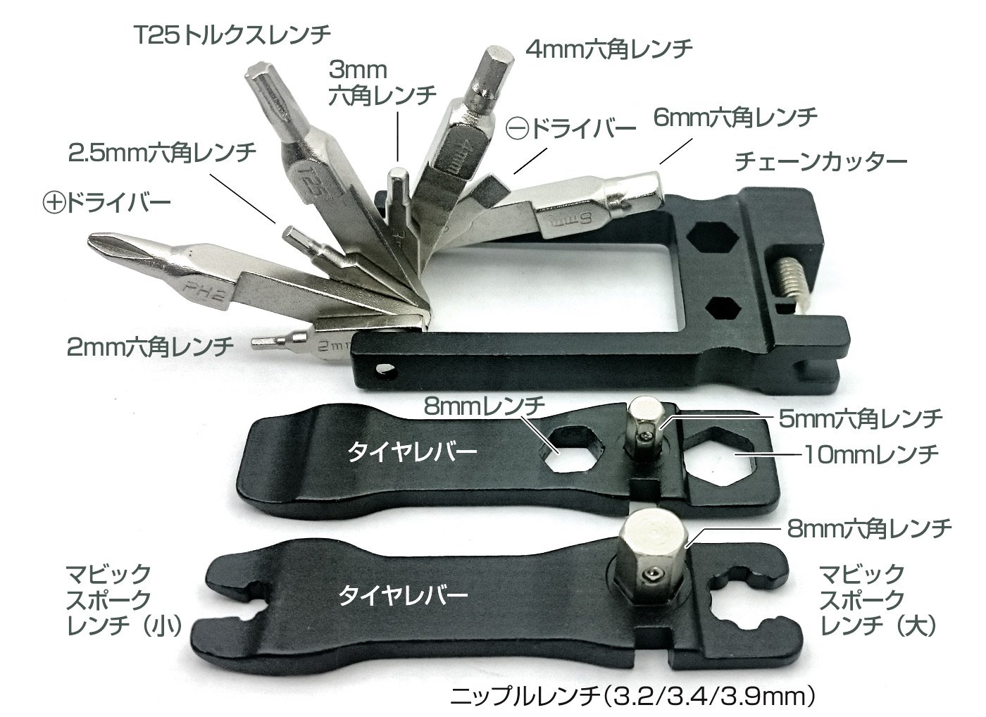 Equipped with tire levers and spoke wrenches, with chain tools for seven to eleven gears.