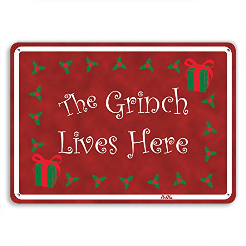 "The Grinch Lives Here" Aluminum Sign, 10" x 7", White and Green on Red, by PetKa Signs and Graphics