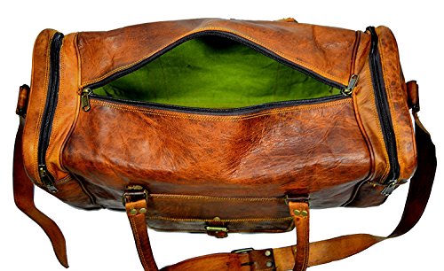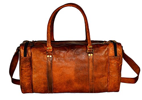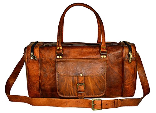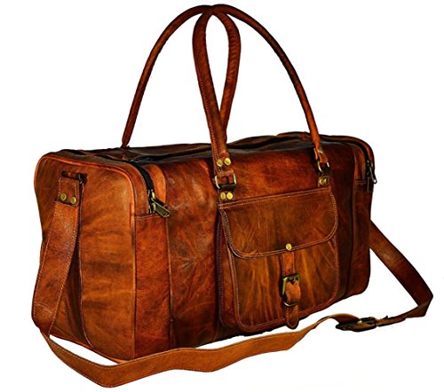 -. Feature : handmade,imported ,leather and canvas. Genuine leather duffle bag Ideal as a gym bag or a carry on travel bag This Leather duffle bag has 100% genuine goat leather, thick hide with no bad smell assured. / This trendy leather bag can also be used as a: cross-body bag, leather bag, gift idea, birthday present, christmas present, vintage bag, quality bag, unisex bag, womens bag, ladies bag, girls bag, leisure bag, everyday bag, real leather bag, brown bag and medium bag. / This stylish, brown shoulder bag is also ideal for use as a: shopping bag, travel bag, camera bag, or gym bag and it stands with its classic yet unusual design / Big main compartments for clothing /travel and sports gear etc Two Side pockets for accessories etc. Front pocket for cash /mobile Adjustable shoulder Strap with Shoulder Pad