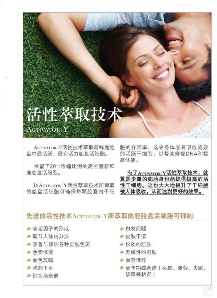 先进的活性技术Activator-Y可抑制衰老因子形成,调节人体内分泌,改善与预防各种皮肤色斑、色素沉着、白发问题、面色灰暗、性衰退、胸部下垂、皮肤干涩、松驰、无弹性、面容憔悴、更年期综合症(头晕、疲劳、失眠、烦躁)等状况。