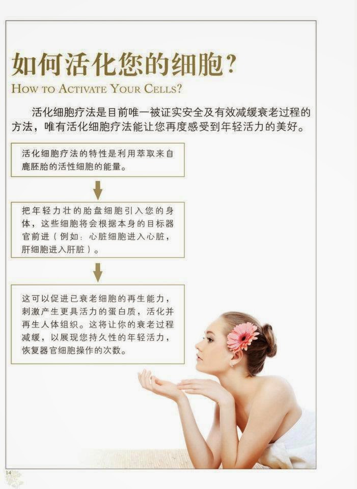 干细胞疗法-活化您的细胞 活化细胞疗法的特性是利用萃取来自胚胎的活性细胞的能量,把年轻力壮的胎盘细胞引入您的身体,这些细胞将会根据本身的目标器官前进(例如:心脏细胞进入心脏,肝细胞进入肝脏)。这可以促进细胞的再生能力,刺激产生更具活力的蛋白质,活化并再生人体组织。