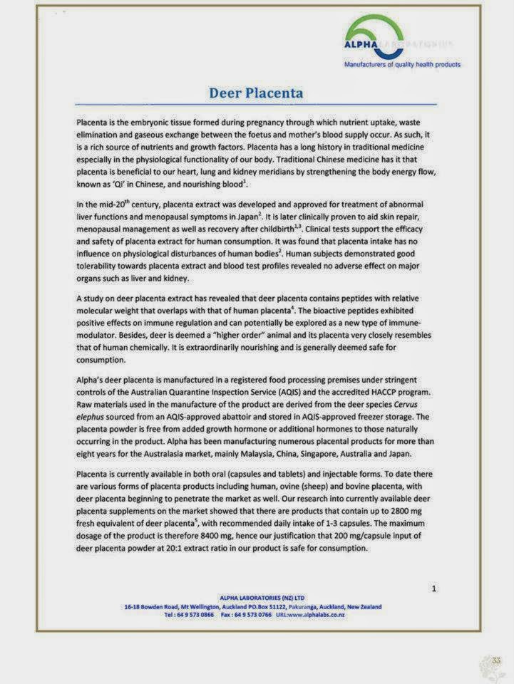 鹿胎盘已被接受为胎盘的主要来源。鹿被认为是"高阶"动物,鹿胎盘非常类似人类胎盘的化学,广泛认同为最上等的胎盘素。它显得格外滋润,是完全可以安全食用。现今胎盘素精华已进展成为人类养生学中最安全有效的滋养品。
