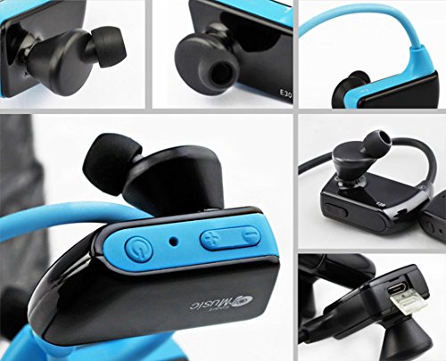-. Feature : Compact, lightweight, comfortable, professional ergonomic design. Suitable for indoor and outdoor sports, cordless, one-piece wearable sports music player. Compact design with 8GB internal storage. The E30 may be compact in size but can store hours of music thanks to the internal 8 GB memory. / Wearable and Wire-free. This one-piece music player's unique design is lightweight, ideal for sports and active lifestyles, this unique digital music player is designed to comfortably wrap-around the back of the head and securely stay in place, so you can run, jump, and train harder. Be wire-free, hands-free, and without distraction whether you're working out at the gym, playing outdoors or even running. / Quick charge battery. Use the included USB cable to get up to 10 hours of use on just 30 minutes of full charge. / High Quality Sound. Exclusive Clear Audio Technologies like Clear Stereo and Clear Bass deliver deeper, richer sound quality. / The model E30 is NOT waterproof, if you need a waterproof MP3, please search for "Megafeis E350".