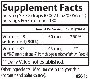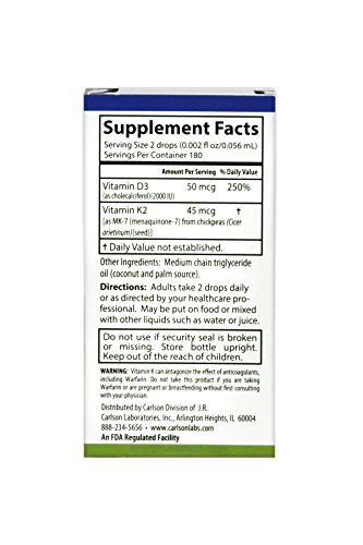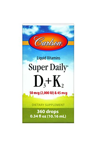 -. Binding : Health and Beauty -. Brand : Carlson -. EAN : 0088395105005 -. Feature : Promotes healthy bones / Supports teeth and gum health / Supports cardiovascular function / 50 mcg of vitamin D3 + 45 mcg of vitamin K2 per serving / Potency and quality guaranteed -. IsAdultProduct : 0 -. Label : Carlson -. LegalDisclaimer : These statements have not been evaluated by the FDA. This product is not intended to diagnose, treat, cure, or prevent any disease. -. Manufacturer : Carlson -. MPN : 1050 -. NumberOfItems : 1016 -. PackageQuantity : 1 -. PartNumber : 1050 -. ProductGroup : Health and Beauty -. ProductTypeName : HEALTH_PERSONAL_CARE -. Publisher : Carlson -. Studio : Carlson -. Title : Carlson Super Daily D3 + K2, 50 mcg + 45 mcg, 360 Liquid Drops -. UPC : 088395105005