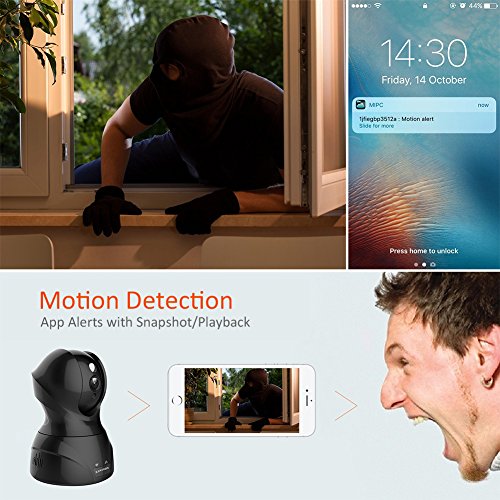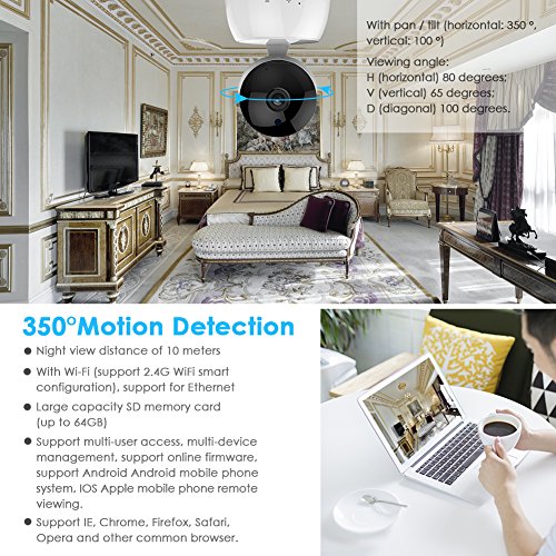 -. Feature : H.264 video compression, transmit HD video in narrow bandwidth. High picture quality, low bit stream and local HD video recording to have a more smooth and uninterrupted watching experience / Built-in Mic & Speaker. Supports two-way audio,Support micro SD card up to 64G for video / Adjustable Pan/Tilt move the camera as you desired. Pan horizontally up to 350°, tilt vertically up to 100° give you a full view of any room. / App alerts with snapshot & record(Micro SD Card Required) to your mobile device when motion is detected.Perfect for monitoring your baby, elder, pets, babysitter and employees. / Free apps for Android and iOS, seamlessly stream video directly to your smartphone, tablet and PC