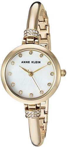 Mother-of-pearl dial with gold-tone hands and Swarovski crystal markers; gold-tone bangle accented with 28 Swarovski crystals; adjustable end links; jewelry clasp and extender