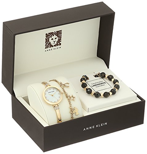 Watch Sizing Guide Accentuate your luxe look with the beauty of this Anne Klein® watch set! The labrodorite bracelet represents transformation and illumination. Boxed set includes watch, charm bracelet, and beaded labradorite bracelet. Stainless steel case. Gold-tone bracelet with crystal detailing and jewelry clasp closure. Round face. Three-hand analog display with quartz movement. White dial features gold-tone hands, crystal hour markers, and Anne Klein detailing. Water resistant. Display case included. Imported. Measurements: Case Height: 26 mm Case Width: 26 mm Case Depth: 8 mm Band Width: 1⁄8 in Band Circumference/Length: 8 in Weight: 1 ozFeature
