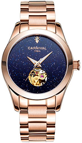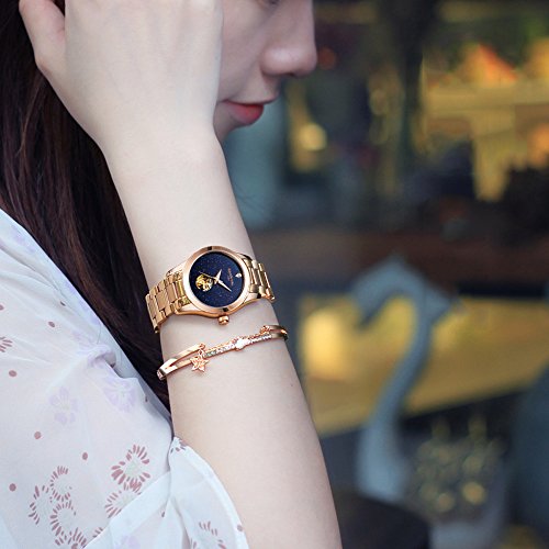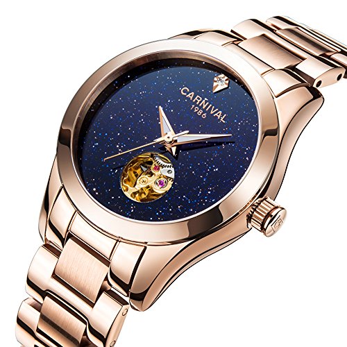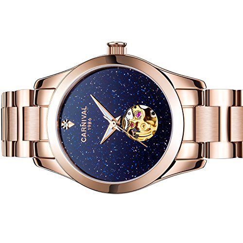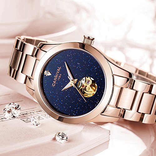 Women's Automatic Mechanical Female Watch Distinctive Sparkling Stars in the Blue Sky Skeleton Dial